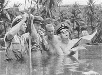 3. McHale states that this is a actually a photograph of Cpt Wallace B. Binghamton in the Taratupa Lagoon in early 1942 trying to recover his skiff which sank after Binhamton accidently shot a hole in its hull with his .45 pistol.